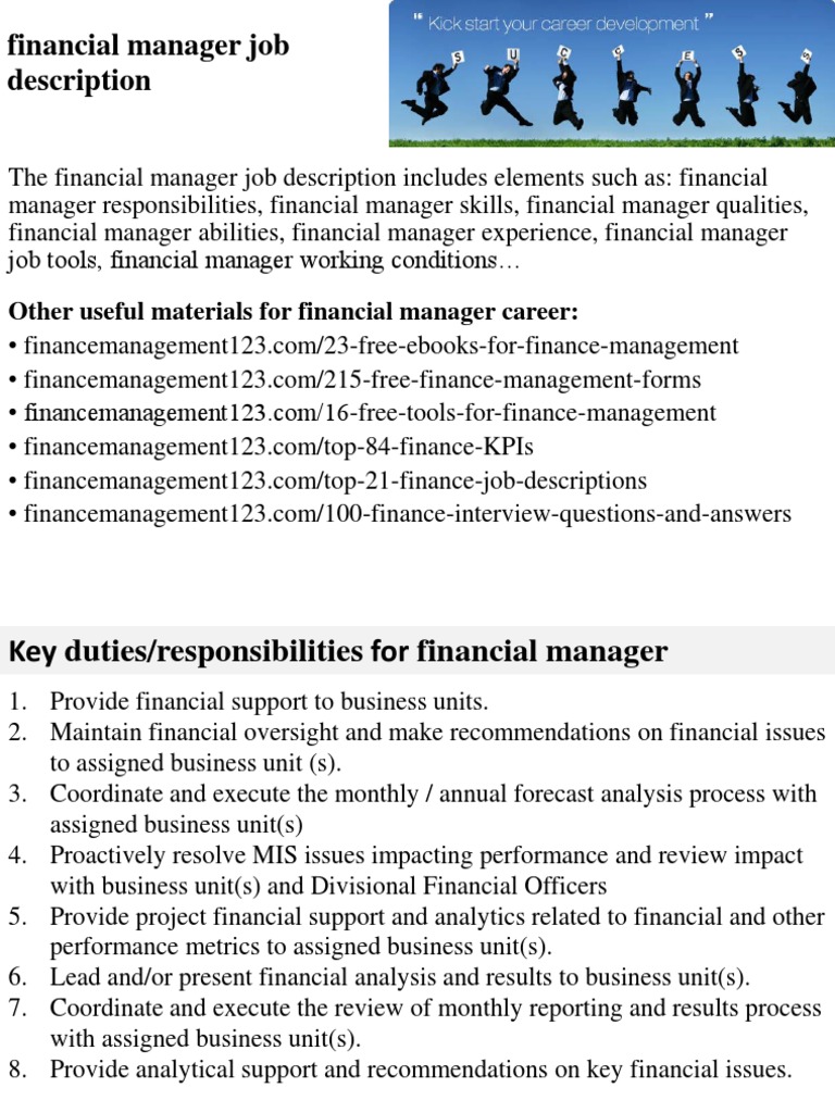 They are the root of all major business decisions and their role is crucial to the success of any organization. 35 per week reports to: Finance managers are business specialists who manage important financial functions of an organization. More than $208,000 ($100.00/hour) bottom 10% annual salary: Corporate finance managers are responsible for identifying and securing merger and acquisition deals, managing and investing large monetary funds, and buying and selling financial products. Less than $69,840 ($33.58/hour) source: Finance managers analyze every day financial activities and provide advice and guidance to upper management on future financial plans. Also, he or she is required to oversee all the financial processes being followed by the company and assure that all the employees in the finance department are functioning efficiently. Unison centre, nw1 overall summary reporting to the financial controller by managing and developing the financial management team and acting as systems administrator for the A job specification of finance manager should be related to his financial education, training and competencies. Finance manager role description and person specification job title: A job specification is an official document which describes the duties, required knowledge, skills and abilities, and minimum qualifications of state jobs. Financial manager job description learn about the key requirements, duties, responsibilities, and skills that should be in a financial manager job description.